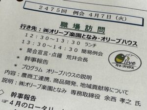 2026年4月7日(火)、 私は現在、小矢部ロータリークラブの職業奉仕委員長を務めており、本日オリーブハウスさんで、職場訪問をさせていたたきました。 ランチは、4つのメニューに絞って、お好みを選択🍽️どれも美味しそう🫒 […]
