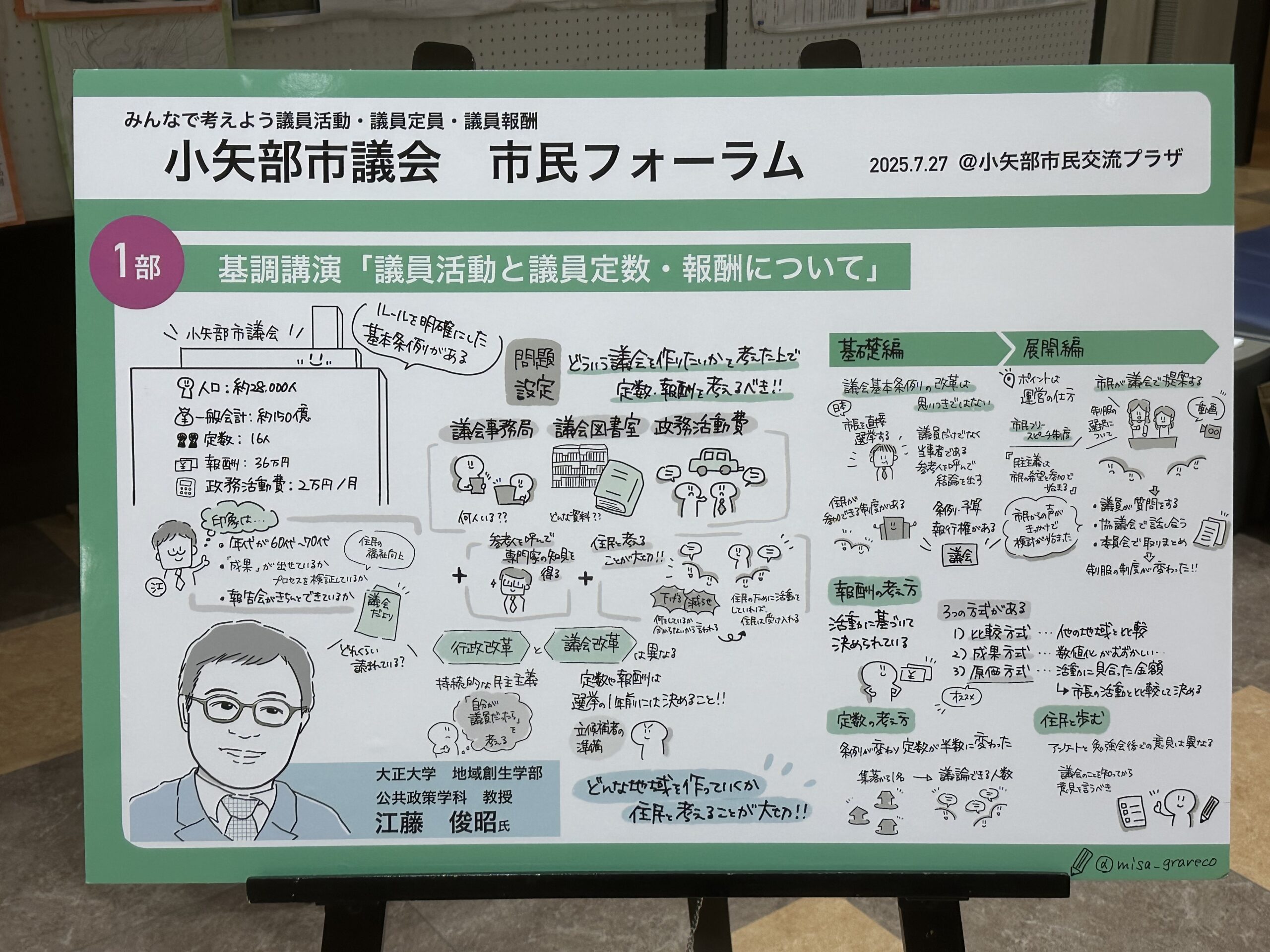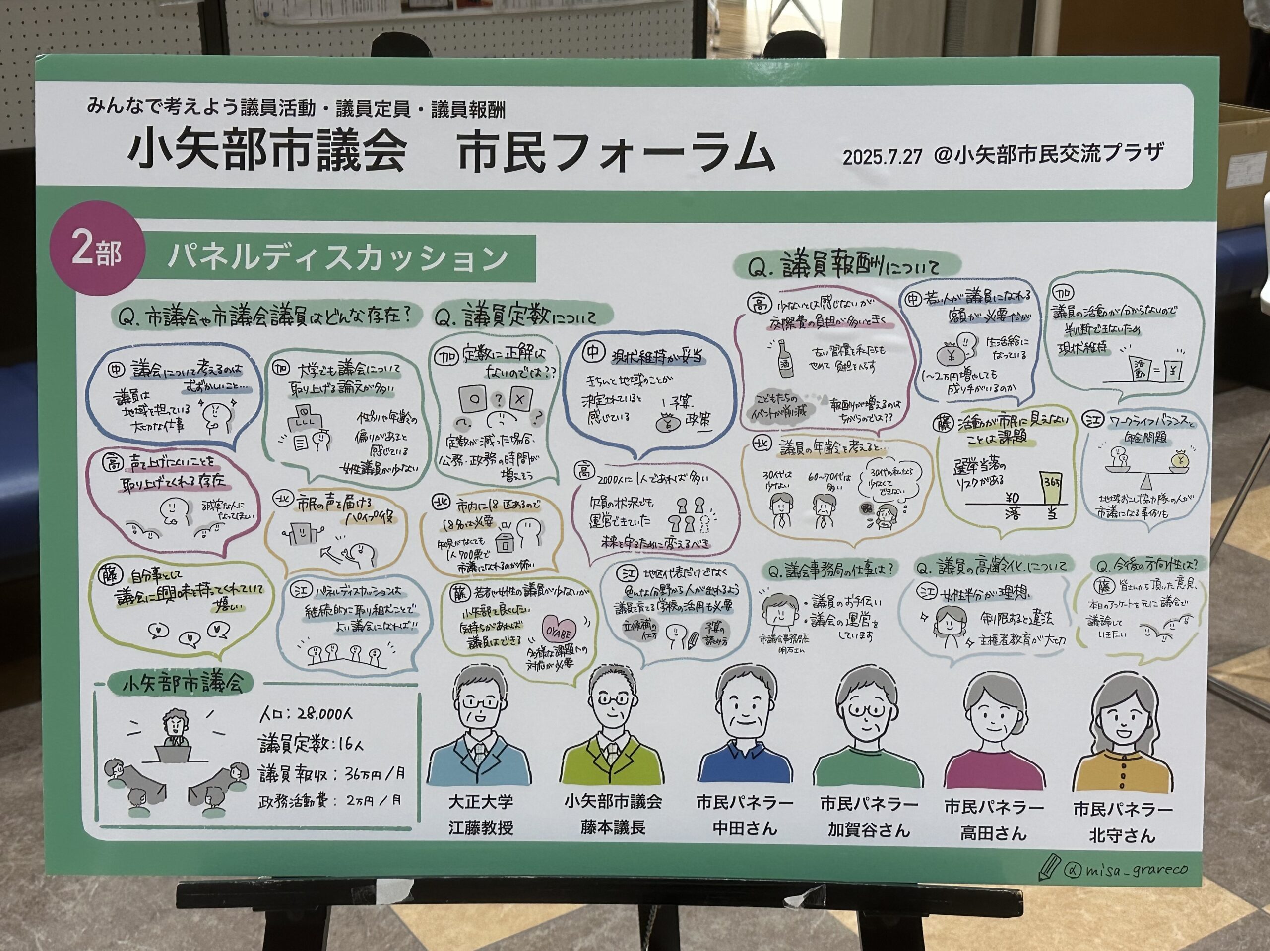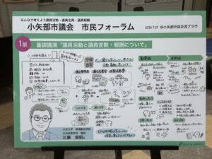 議会報告会2025 2025年10月9日 最終更新日時 : 2025年10月9日 admin 2025年10月9日(木)、 今晩19時〜、市民交流プラザ多目的ホールにて、小矢部市議会「議会報告会2025~議員と語ろう みらいトーク!~」を、ワークショップ形式で開催。 テーマは、「議会改革についてみんなで考えよう!〜議員活動と成り手不足〜」 多くの貴重なご意見を参考に、議会改革を進めてまいります。 受付入り口では、7月開催の市民フォーラムのグラフィックレコーディングのパネルを掲示。