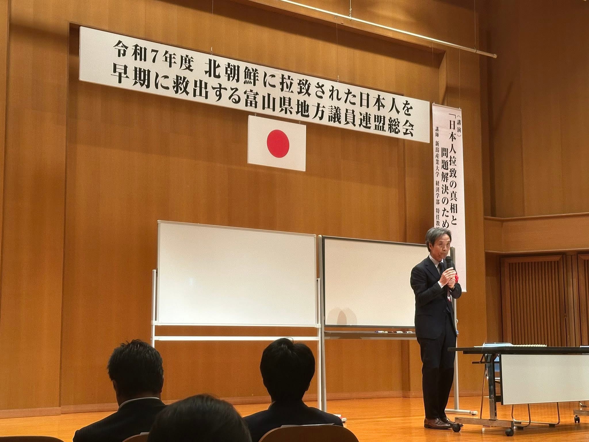 北朝鮮に拉致された日本人を早期に救出する富山県地方議員連盟総会・記念講演 2025年8月18日 最終更新日時 : 2025年10月22日 admin 2025年8月18日(月)、 本日13時30分〜、北日本新聞ホールにて、「北朝鮮に拉致された日本人を早期に救出する富山県地方議員連盟総会」並びに「記念講演」が開催されました。 記念講演の演題は、「日本人拉致の真相と問題解決のための諸条件」 講師は、新潟産業大学経済学部 特任教授 蓮池薫 氏。 拉致被害者本人の大変貴重な講演でありました。
