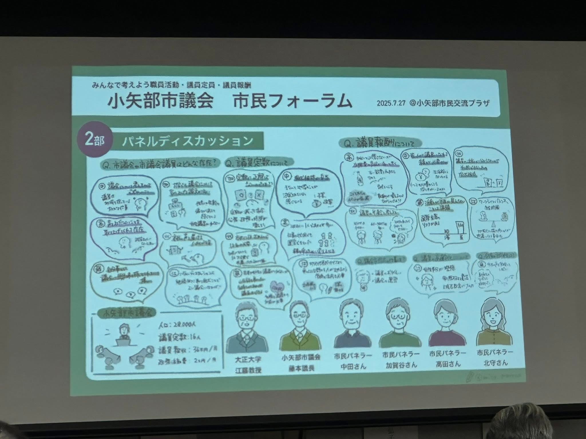 議会改革に関する市民フォーラム 2025年7月27日 最終更新日時 : 2025年10月23日 admin 2025年7月27日(日)、 今日は、14時〜、小矢部市民交流プラザにて、小矢部市議会「議会改革に関する市民フォーラム」を開催。 第1部は、基調講演「議員活動と議員定数・報酬について」 講師は、大正大学 教授 江藤 俊昭 氏 第2部は、市民公募のパネラー4名、議長及び教授によるパネルディスカッション ファシリテータは、徳田 琴絵 氏 また、グラフィックレコーディングは、島田 美沙 氏 参加の市民の皆さんにとっても、我々市議会議員にとっても、大変勉強になりました✌️