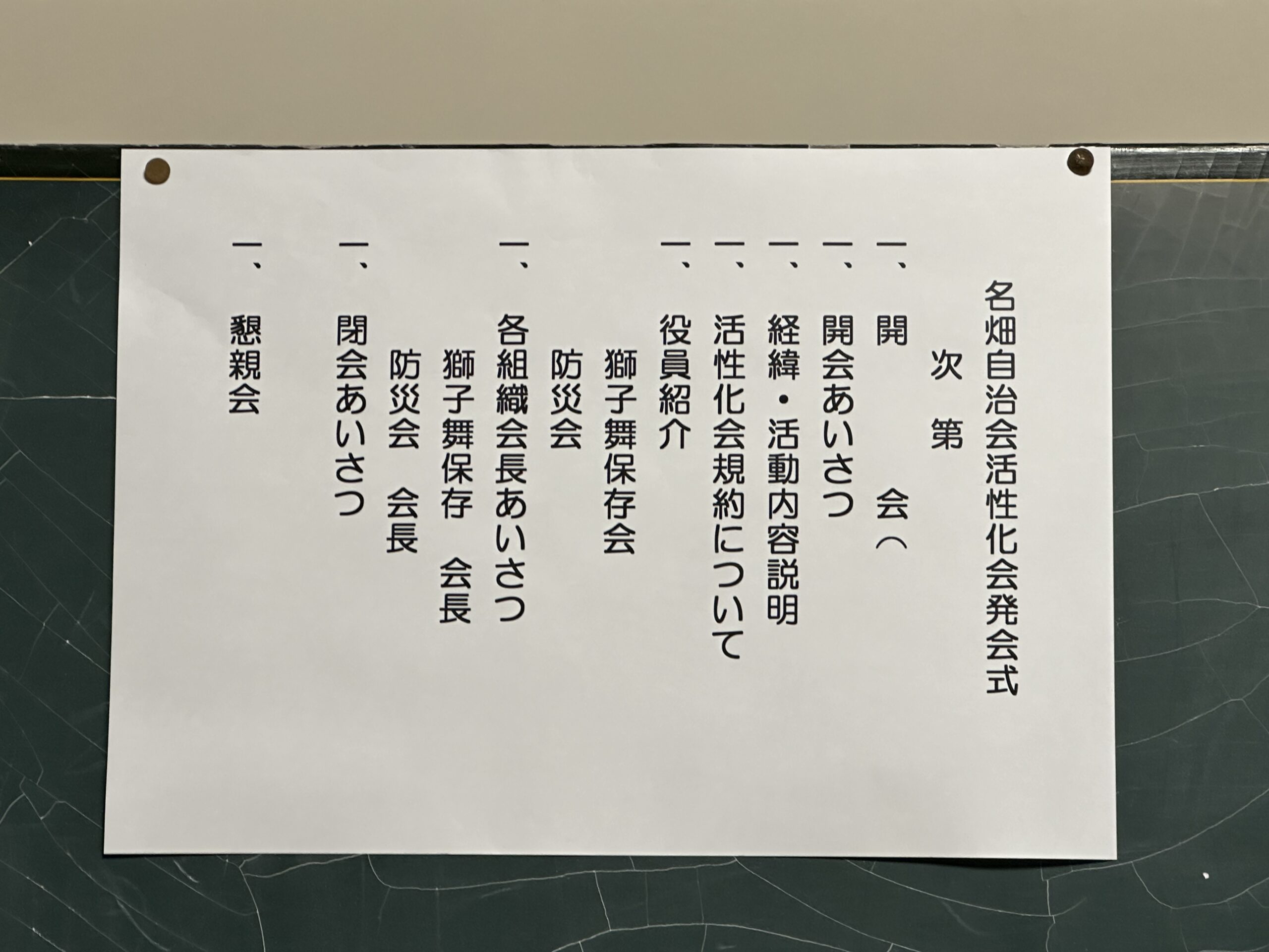名畑自治会活性化会発会式 2026年2月1日 最終更新日時 : 2026年2月1日 admin 2026年2月1日(日)、 本日17時からは、名畑会館にて、名畑自治会活性化会発会式が開催され、出席。 これまで、名畑青年団が獅子舞を続けてきて、名畑消防組においても中心的役割を果たしてきましたが、いよいよ少子化の波が😔 獅子舞については獅子舞保存会を設立し、名畑消防組については防災会を立ち上げて活動を行っていくことになりました💪