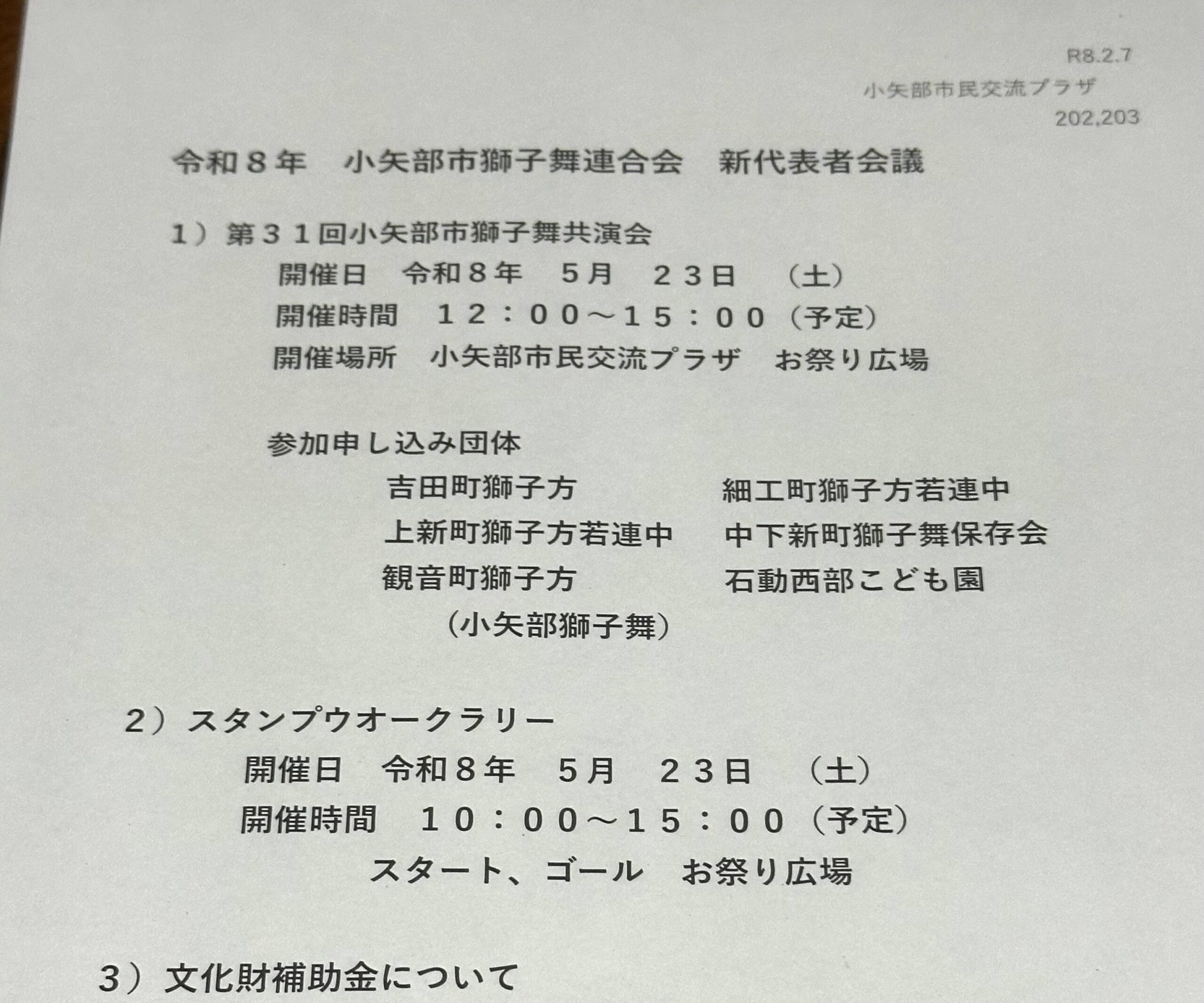 小矢部市獅子舞連合会 新代表者会議 2026年2月8日 最終更新日時 : 2026年2月8日 admin 2026年2月7日(土)、 本日19時〜、市民交流プラザにて、小矢部市獅子舞連合会の新代表者会議が開催され、私は副会長、妻は石動西部こども園副園長として、たまたま一緒に出席。 幹事長が所用で欠席のため、私が進行役。 今年の獅子舞共演会&スタンプウォークラリーは、5月23日(土)に予定しています。