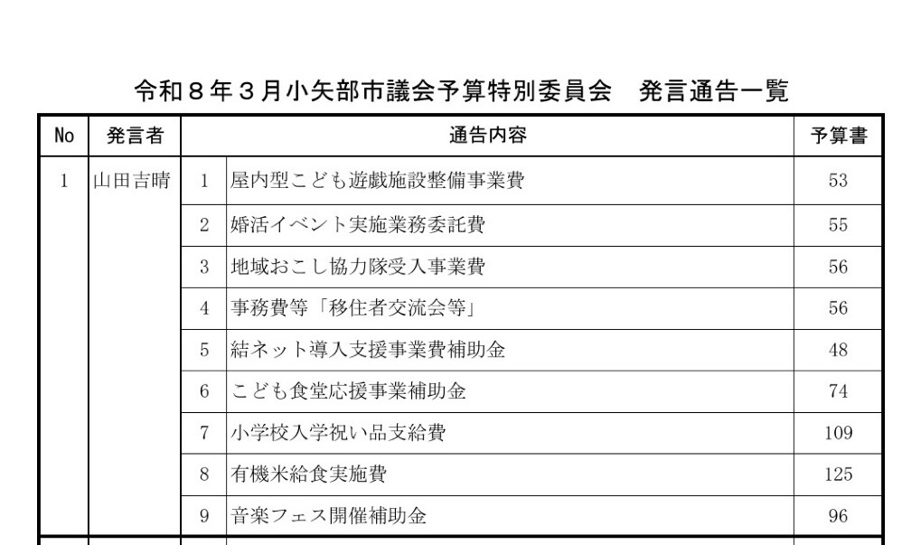 小矢部市議会 予算特別委員会 2026年3月13日 最終更新日時 : 2026年3月13日 admin 2026年3月13日(金)、 今日から、予算特別委員会が始まりました。 議席番号順に質問に立ちますので、私がトップバッター。 そして、質問が終わったら、予算特別委員会の副委員長ですので、自席から副委員長席に移動。 来週16日、17日と3日間続きます。 Screenshot