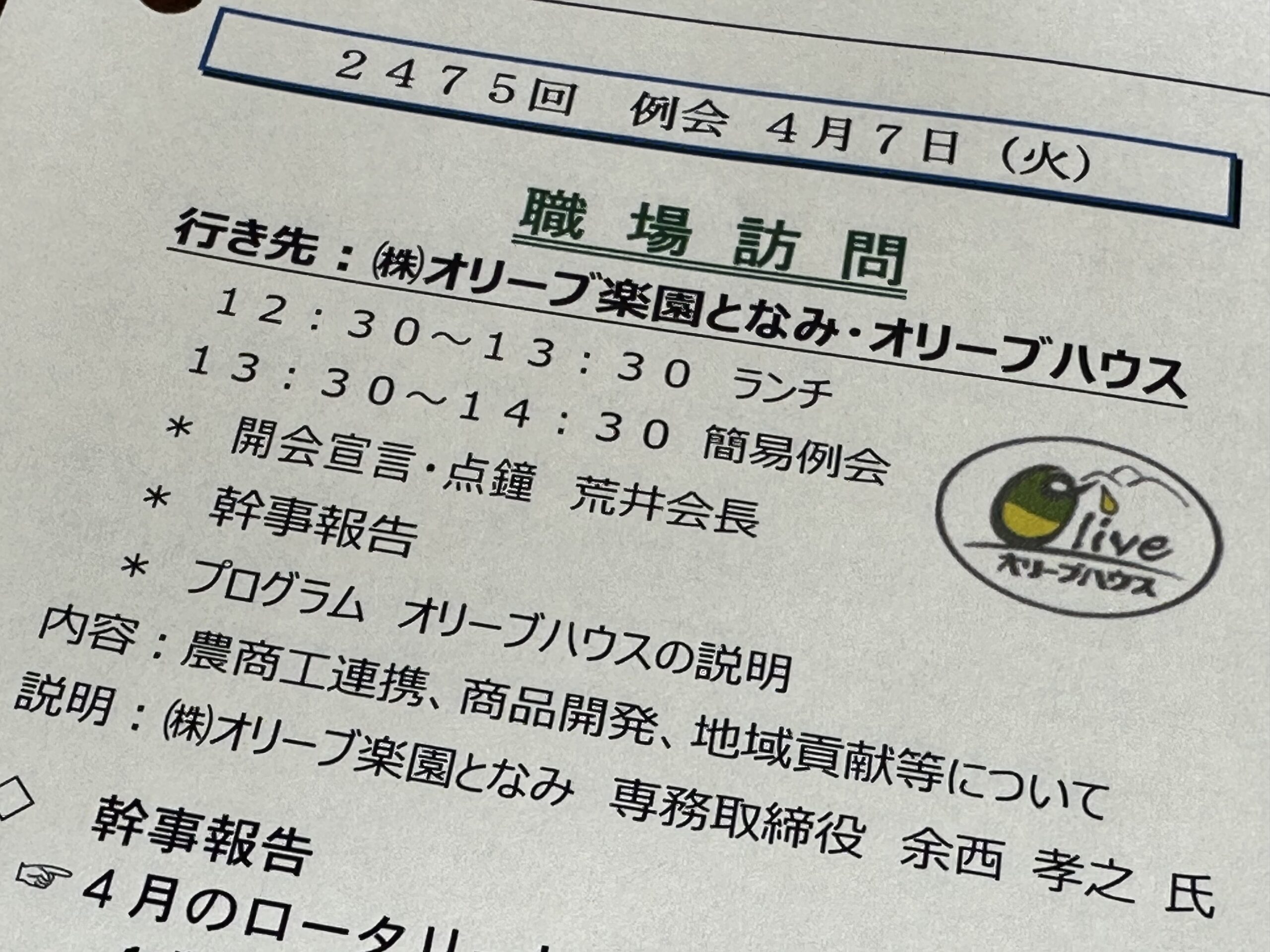 小矢部ロータリークラブ 職場訪問 2026年4月7日 最終更新日時 : 2026年4月7日 admin 2026年4月7日(火)、 私は現在、小矢部ロータリークラブの職業奉仕委員長を務めており、本日オリーブハウスさんで、職場訪問をさせていたたきました。 ランチは、4つのメニューに絞って、お好みを選択🍽️どれも美味しそう🫒 オリーブ楽園となみの皆さんをはじめ、すべての方々に感謝です。