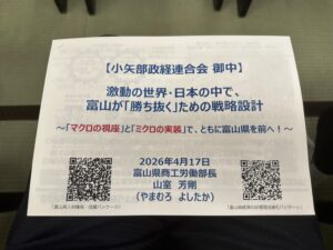 小矢部政経連合会 講演会 2026年4月17日 最終更新日時 : 2026年4月18日 admin 2026年4月17日(金)、 本日17:30〜、ばんばにて、小矢部政経連合会の講演会・情報交換会が開催され、講演会のみ参加。 講師は、富山県商工労働部長 山室芳剛氏 講演テーマは、激動の世界・日本の中で、富山が「勝ち抜く」ための戦略設計 ~「マクロの視座」と「ミクロの実装」で、ともに富山県を前へ!~ 世界情勢の中での日本、日本の中での富山県について、勉強になりました✌️ 私も頑張ろう💪