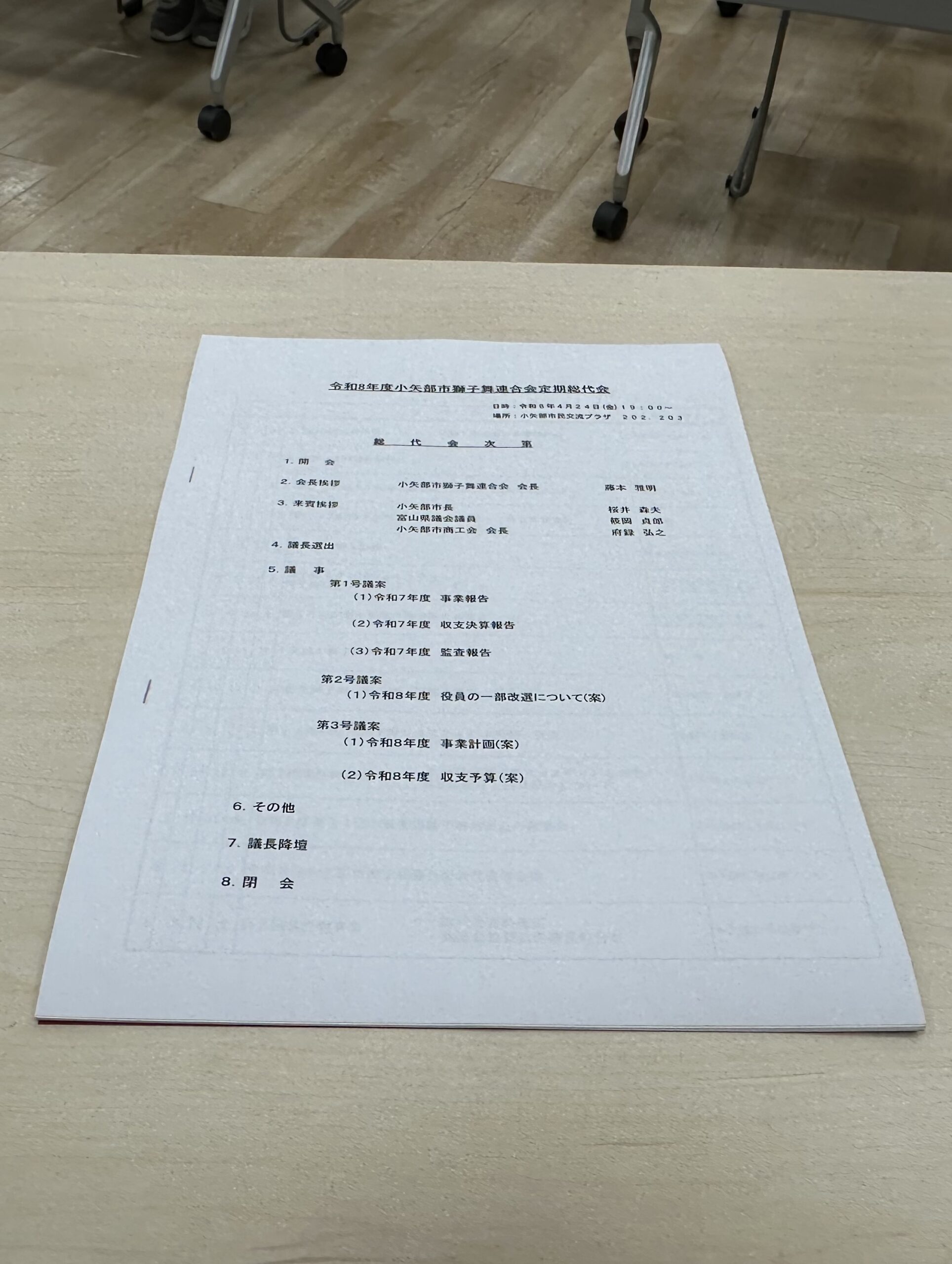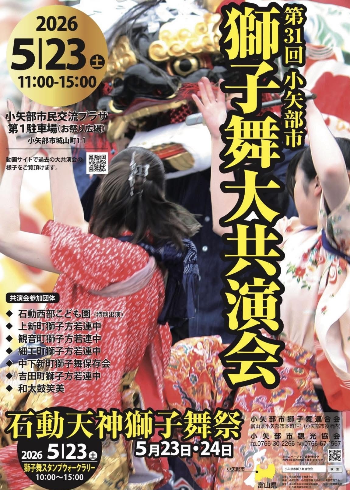 小矢部市獅子舞連合会 定期総代会 2026年4月25日 最終更新日時 : 2026年4月25日 admin 2026年4月24日(金)、 本日19時〜、小矢部市民交流プラザにて、小矢部市獅子舞連合会の定期総代会が開催。 来月23日(土)は、第31回獅子舞大共演会‼️